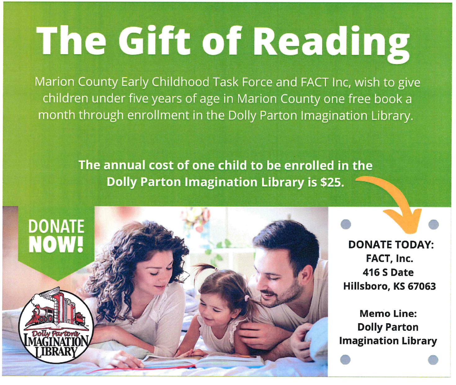 Join the Marion County Early Childhood Task Force and FACT Inc. as we celebrate "Family Friday" for NAEYC's Week of the Young Child! This year we are asking for support to help our youngest community members as we raise funds to provide each child under five years of age one book a month through enrollment in the Dolly Parton Imagination Library. The annual cost for one child to be enrolled in the Dolly Parton Imagination Library Program is $25.