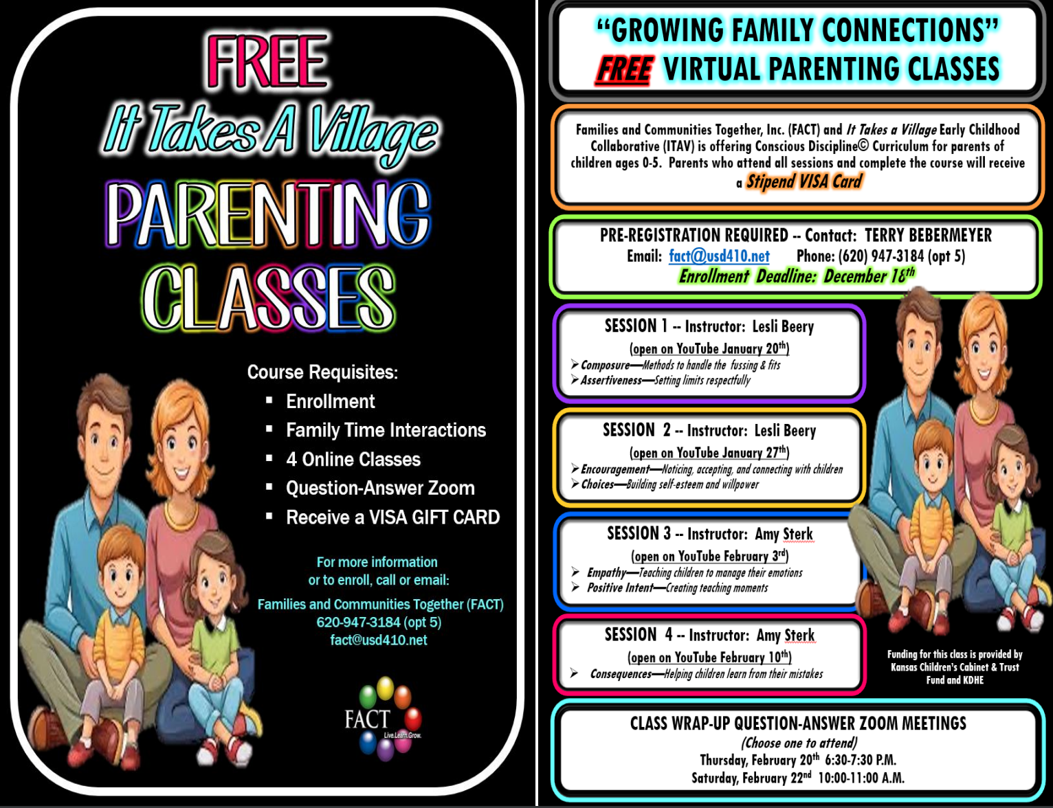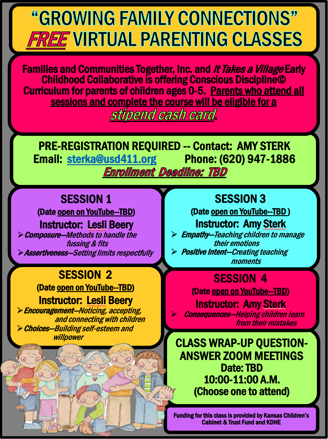 FACT, Inc. sponsors Parent/Educator Education classes, workshops, and/or training throughout the county which are usually focused on the Conscious Discipline Model by Becky Bailey. Most of these classes are approved for KDHE training hours.